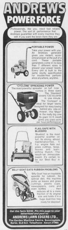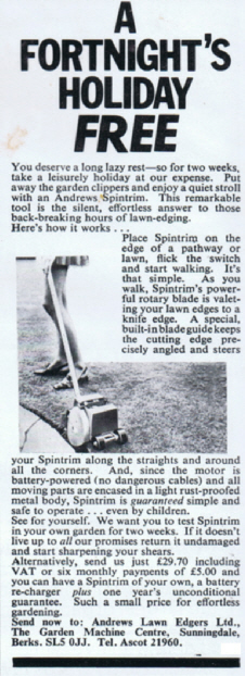 Andrews Lawn Edgers LTD sold many items including the Spintrim lawn edger, Billy Goat vaccuum, Bluebird scarifier and the Cyclone spreader.
