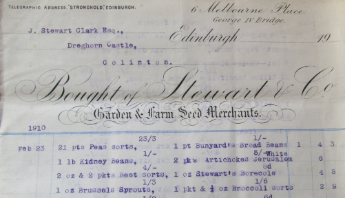 The gardener’s seed order is quite interesting and tells of what was being grown in the early 1900s. It was sent to Stewart & Co, Garden & Farm Seed Merchants, 6 Melbourne Place, (on the corner of Victoria Street), Edinburgh, in February 1910. This building was demolished in 1967.