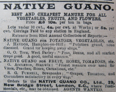 Several items were ordered along with the seeds. Fertilizer and soil improvers included 2 cwts Canary Guano (of which many importers’ fortunes were made), 1 cwt bone dust, and 1 cwt nitrate of soda.