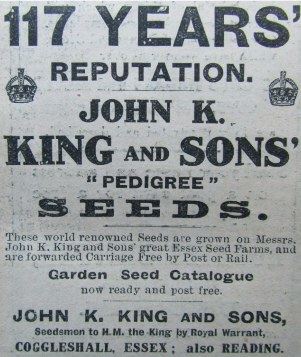 In recent issues of The Cultivator magazine, Andrew Hall wrote about seed packets and the people and companies behind some of the famous names, such as Carters and Suttons. Indeed, some of the seed merchants go back a long time. For example, as in the shown advert, by 1910 John K. King and Sons had 117 years of reputation and at the time a Royal Warrant to the King.