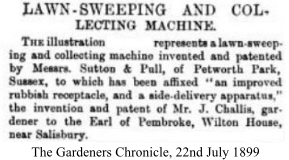 To make emptying easier, Mr Challis, the head gardener for the Earl of Pembroke at Wilton House, Salisbury, took Sutton & Pulls sweeper and created his own lawn sweeper design, he secured a patent in 1899. Contemporary articles state this certainly was an adaptation of Sutton & Pull’s earlier design, thus Challis’ new machine (as in the colour and black & white images) was a combination of his and theirs. The patent drawings show similarities. (See excerpt)