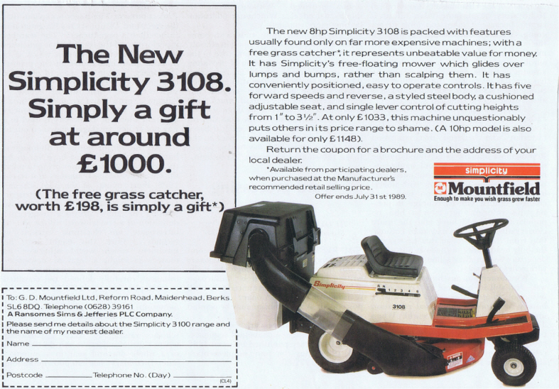 - Simplicity 8hp 3108 Ride-on-mower Advert