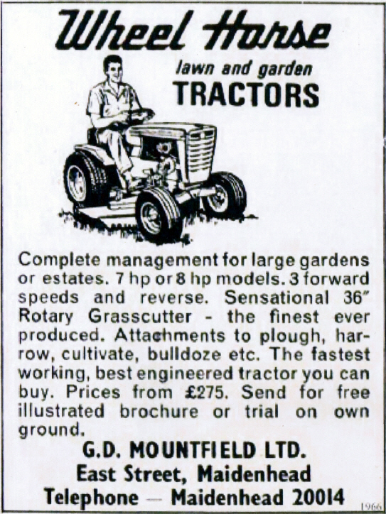 G.D.Mountfield of Maidenhead were the main importers of Wheel Horse garden tractors and equipment. Many tractors have a G.D.Mountfield identification plate.